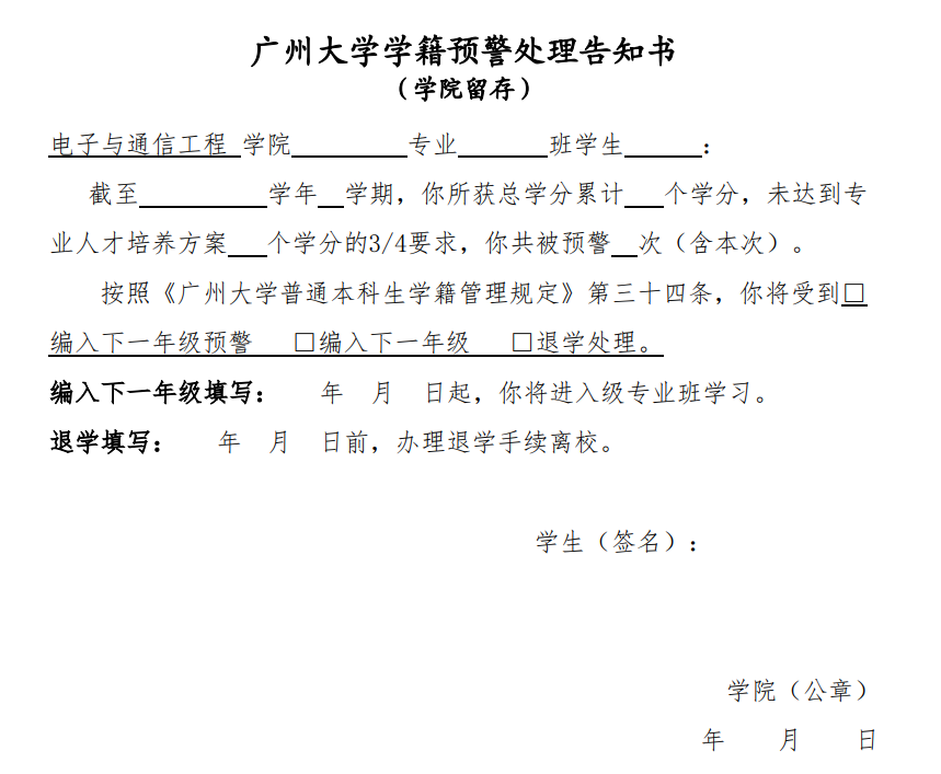 3.各班班主任负责召集需预警的学生进行谈话,并做好谈话记录,提示其面临的学习危机,帮助其制定合理的选课、学习计划。将《学籍预警处理告知书》逐一下达给被预警学生,并要求其在学院留存页上签名。同时要求学生本人书面写出《学业状态修正计划》(A4纸张大小)。《学业帮扶情况一览表》及《学业帮扶谈话记录表》由教务办负责提供。