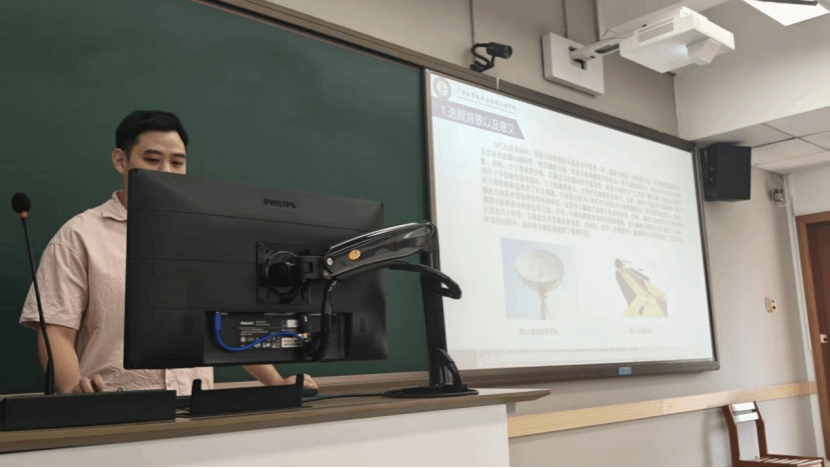 杨煜同学汇报的主题是基于人工表面等离激元的漏波天线,人工表面等离激元(SSPP)是表面等离激元概念在低频段的类比延伸拓展,是电磁波与人工电磁媒质相互作用时在媒质界面产生的一种混合表面电磁模式,具有深亚波长、局域场增强以及非线性色散曲线等特性,在传感器、微波电路、电磁吸波材料、消色差微波器件、天线、环形器等设计中具有重要的应用价值。得益于SSPP的深亚波长特性,基于SSPP的新型电磁器件具有结构紧凑、重量轻、成本低等应用优势,在高集成化的无线通讯系统中有广泛的应用前景。