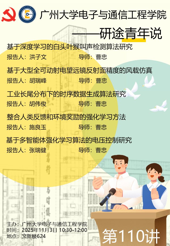 ”第110讲于11月3日10:30-12:00在文新楼624举行。本次主讲人为23级研究生洪子文、胡瑞峰、胡伟俊、施良玉和张瑞健。