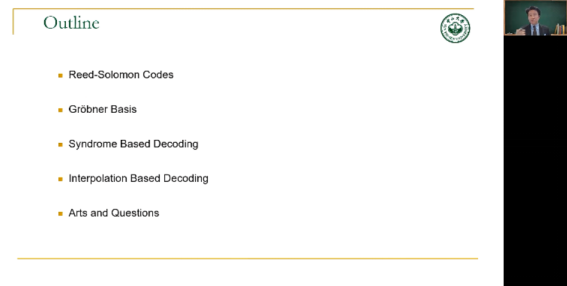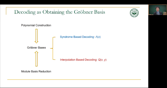 陈立教授首先简要讲解了信息论与编码的发展历史,接着介绍了Reed-Solomon Codes的发展历程,实现原理与结构,接着讲述了Gröbner基的数学原理与如何用Gröbner基去理解Reed-Solomon的译码问题,之后,陈立教授通过讲述基于伴随量处理和插值处理两种主流代数译码方法的原理与实例,来解释如何通过多项式构造或逻辑约简的方法来实现代数译码。最后陈立教授讲述了插值处理比起伴随量处理的优越性并且讲述了基于插值处理方法目前的研究与优化空间