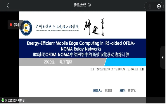 第二位进行汇报的是罗至威同学,他从研究背景,相关技术,问题建模和求解,仿真结果和总结4个方面进行介绍。他首先向我们介绍了边缘计算的概念和优点,并讲解了边缘计算的几个相关技术,包括IRS技术,NOMA技术,智能反射面技术,协作中继传输技术。总结出可以利用具有计算能力的无线通信节点作为协作中继,协助分担计算任务,利用IRS改善信道,采用NOMA技术进行数据传输,提高传输效率,在频率选择性衰落信道上实现高效的任务卸载和分配,节省完成任务计算需要的总消耗。然后他提出了问题的建模和求解方法,即需要凸优化的背景知识和用到协作卸载与计算联合优化算法。最后展示了仿真的结果并从仿真结果得出结论:在MEC系统中使用NOMA可以节省约50%的能耗,同时使用NOMA和IRS可以节省60%-80%的能耗。
