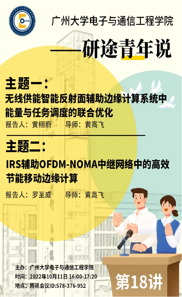 主办的“沿途青年说”第18讲于10月11日下午16:00-17:20在线上(腾讯会议:578-376-952)举行。本次主讲人为20级研究生黄栩蔚以及罗至威,主题分别为无线供能只能反射面辅助边缘计算系统中能 量与任务调度的联合优化,以及IRS辅助OFDM-NOMA中继网络中的高效节能移动边缘计算。