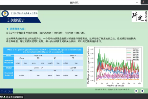 第一位进行汇报的是陈昊森同学,他从研究背景,研究现状,系统框架,算法细节,研究结果五个方面进行介绍。他首先向我们介绍了深度学习目前存在的问题和分布式机器学习的数据并行的框架。分析选题现状,介绍分布式SGD的概念和优点。总结目前研究工作的动机创新点和贡献,提出研究工作的两个难点。在系统框架部分,着重讲解系统架构中的两个关键设计,逐类聚类方案:逐类聚类和确定聚类的簇类。接下来讲解CL-SGD算法和研究成果,在实验中表明,CL-SGD可以在几乎没有精度损失的情况下实现令人满意的压缩比。显著提高了各种DNN模型的训练效率。最后介绍了该领域未来的工作方向。