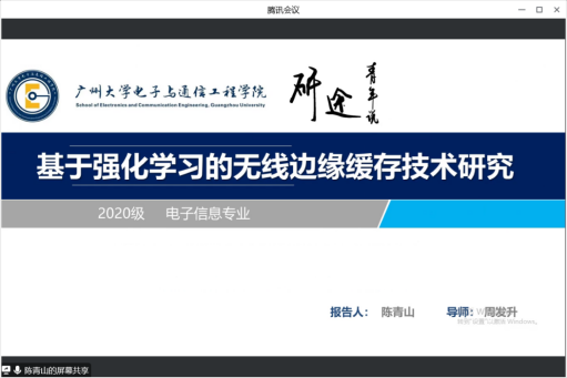 第二位进行汇报的是陈青山同学,他从选题背景及意义,现状与研究目标,研究方法及过程,实验结果四个方面进行介绍。他首先用了一个通俗易懂的例子来介绍目前大数据时代的数据缓存技术,无线边缘缓存被提出来减少回程链路压力,提高通信服务质量。提出强化学习处理决策问题。指出目前传统系统模型方法存在的一些问题,使用无限边缘缓存技术,且设计dqn算法,得出比传统算法更加优秀的结果。且其用实验结果论证提出的算法与随机算法相比的优越性。最后做出一个对该汇报的总结并且感谢了老师同学的聆听提问。