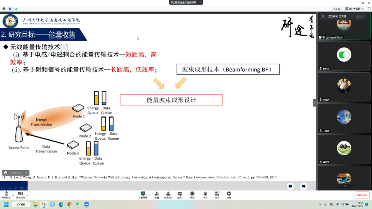 ”第27讲于12月16日下午16:00-17:30在线上(腾讯会议ID:355-313-497)举行。本次主讲人为20级研究生阮文达和王天恒,主题分别为基于ResNet的长臂猿鸣声检测和基于信息年龄感知的缓存辅助无线供能多址通信系统。