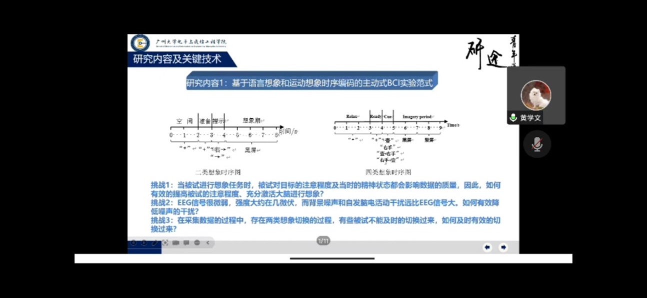 主办的“沿途青年说”第32讲于3月14日下午16:00-17:20在线上(腾讯会议:183-767-427)举行。本次主讲人为20级研究生詹倩倩,黄学文,李宏寅,主题分别为基于黎曼流形的脑电信号异构标签空间迁移,基于时序编码的主动式脑机接口特征识别研究,基于深度学习的图像超分率算法研究。