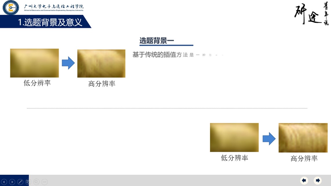 选题背景及意义:首先介绍超分辨率的概念,以及两个选题背景,传统的插值方法和利用深度学习的超分辨率算法可以避免传统的插值方法存在的一些问题。现状与研究目标:目前研究存在的三个难点,总结起来为,数据、训练、应用。研究方法及过程:目前有三个方法,1.基于增强深度残差网络的超分辨算法研究。2.基于参考图像的超分辨算法研究。3.基于GAN网络的超分辨率算法研究。关键技术与实践难点:目前亟待解决点问题场景单一、过滤样本、模型参数量多。并且分别给出了这三个问题的解决方法。最后李宏寅同学总结论文以及已经目前所取得的成果。