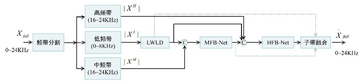 两阶段模型是指将原输入(0-24KHz)经过傅里叶变换后,得到频域信号。将分解成低频带(0-8KHz)和高频段 (8-24KHz)。该模型通过预训练的低频带语音增强系统(第一步)和高频带语音增强系统(第二步)对全频带进行增强。高频带语音增强系统将预训练的低频带模型的输出,与高频带的噪声语音一起作为高频带模型的输入,保证了良好的泛化能力。