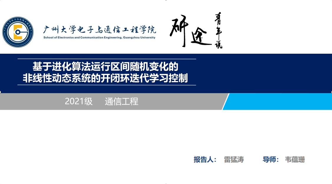 雷猛涛同学汇报的主题是基于进化算法运行区间随机变化的非线性动态系统的开闭环迭代学习控制,他的讲解主要包含以下六个部分:选题背景及意义、国内外现状与研究目标、研究方法及过程、关键技术与实现难点、研究结果与应用、论文总结。雷猛涛同学简述了迭代学习控制的引入标志着控制理论的新篇章,为未来智能控制系统的发展提供了崭新的方向。其与深度学习、强化学习等前沿技术的结合将推动控制领域的前沿研究。本项目以具有重复运动性质的运行区间随机变化的动态系统作为研究对象,结合国内外的研究现状,设计开闭环迭代学习控制器,使系统能够完成期望轨迹的跟踪任务。展示研究结果:将基于差分进化算法的迭代学习控制应用于实际工程系统,如某一制造流程或机器人控制,验证其在实际应用中的有效性和稳定性。