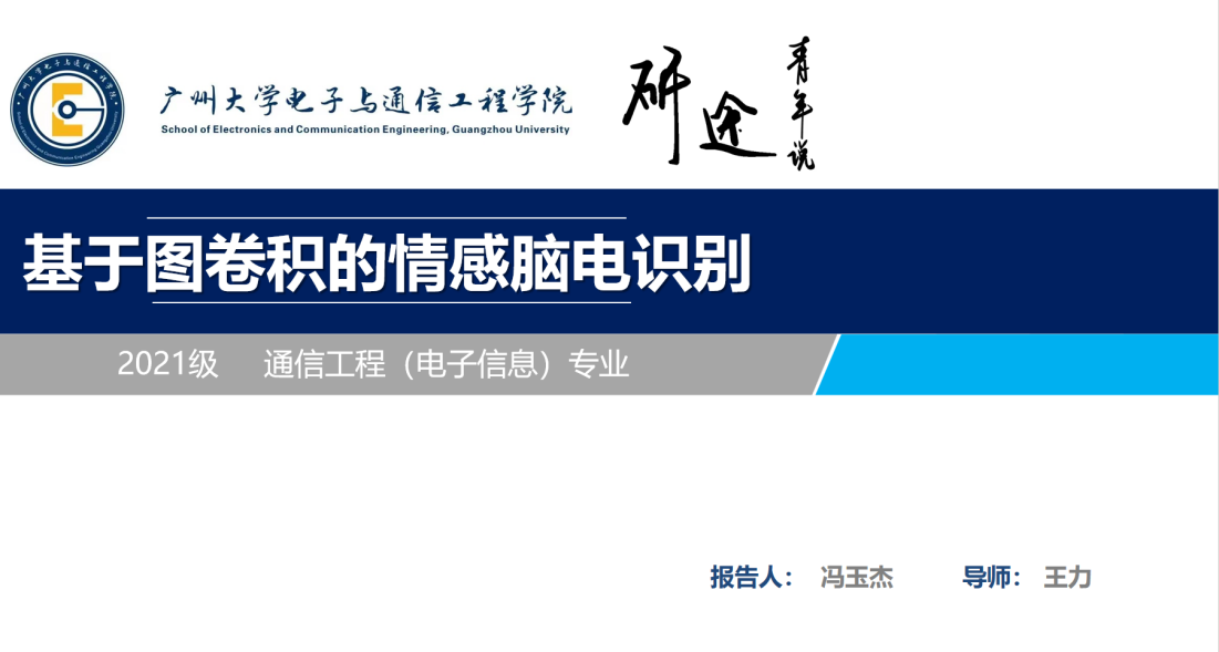 冯玉杰同学汇报的主题是基于图卷积的情感脑电识别,她的讲解主要包含以下六个部分:选题背景及意义、现状与研究目标、研究方法及过程、关键技术与实现难点、研究结果与应用、论文总结。她首先阐述了情感识别研究的目的在于让机器有能力对表征人类情感状态的信号进行判断,以实现人机交互。图卷积神经网络所用到的图数据既要考虑节点信息,也要考虑结构信息。针对不同受试者都能有较高的准确率,稳定性、准确率均优于对比实验。最后指出,对于本模型将来可以运用在客户服务(分析客户的情绪,以更好地理解他们的需求和满意度);在线教育(评估学生的情感状态);驾驶安全(监测驾驶员的情感状态,以提高驾驶安全性)。