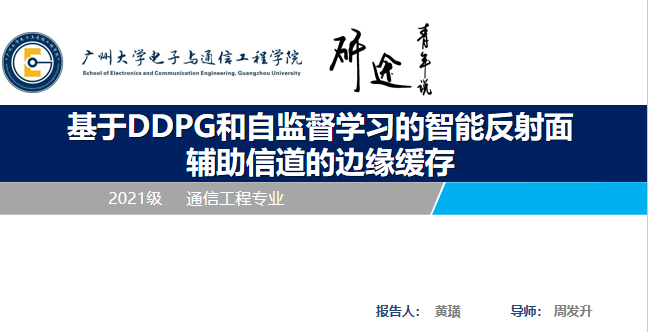 黄璜同学汇报的主题是基于DDPG和自监督学习的智能反射面辅助信道的边缘缓存,他的讲解主要包含以下7个部分:选题背景及意义、现状与研究目标、研究方法及过程、关键技术与实践难点、研究结果与应用、论文总结、生活感悟。黄璜同学讲述了智能反射面(IRS)是由大量放置在基站和用户之间的被动式低成本反射元件组成的平面。之后讲了创新方向是引入了属于物理层的时延功率谱(APDP)指标来评估用户和小基站之间的信道质量,基于现状通过部署IRS和学习一个合理的缓存放置策略来最大化所考虑的系统的频谱效率,并提出了一种基于深度强化学习和自监督学习框架的方法来预测IRS相位和协作缓存策略。针对边缘缓存策略设计深度强化学习算法找出最佳的缓存策略,提升系统的通信性能。第一次用强化学习算法同时优化IRS和缓存策略,允许用户在一定范围内速度随机变化,考虑的IRS辅助的通信场景更符合现实,提出功率时延谱这一指标来锁相。最优的功率时延谱的时延与最优相位一一对应。数值仿真结果表明,该算法比现有算法具有更好的收敛速度和学习精度,有望应用于未来的大规模动态内容交付应用中。同时提出的算法在训练复杂度上更优于传统算法。当问题的规模较大时,所提出算法更有利于系统的快速响应,从而大大减少推理延迟。