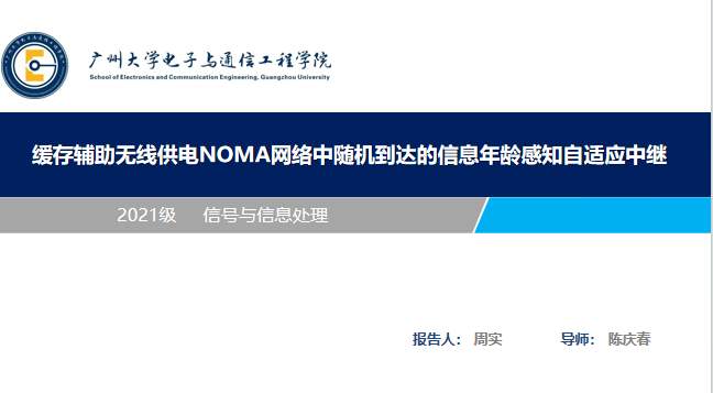 周实同学汇报的主题是缓存辅助无线供电NOMA网络中随机到达的信息年龄感知自适应中继,他的讲解包括以下四个部分:选题背景及意义、研究内容、研究思路与方法、研究结果。首先他讲述了随着5G等技术的不断进步,物联网( Internet of Things,IoT )近年来呈现爆发式增长。5G技术因其更高的速率、更低的时延和更大的容量,正在推动各行业的数字化转型,并大力推动智慧城市、自动驾驶汽车、远程医疗和物联网等应用。物联网应用中存在大量的实时感知和监控任务,其中信息的新鲜度起着至关重要的作用。例如,在自动驾驶汽车、无人机和工业控制网络中,设备需要及时接收来自控制中心的控制命令,以保证系统正常运行。他的主要研究内容是考虑一个由一个源(S)、一个中继(R)以及两个用户{U_1,U_2}NOMA下行系统,两个用户和源节点之间由于地形限制、路径损耗等因素没有直接的链路,需要通过中继在半双工模式下将基站的信号转发给两个用户,同时,中继还为源节点进行充能服务。