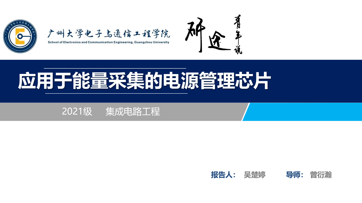 吴楚婷同学汇报的主题是应用于能量采集的电源管理芯片,她的讲解主要包括以下五部分:选题背景及意义、研究现状与目标、研究方法及过程、关键技术与实践难点、研究结果与应用。研究背景源于物联网的发展,特别是为无线传感节点供电的需求。目前,传感器主要依赖电池供电,但电池的续航时间短,需要定期更换,因此,环境能量的收集变得越来越重要。研究方法结合了理论和实践,利用模拟集成电路知识,通过Cadence IC617工具进行电路设计和仿真。研究过程涉及微弱电压输入,最大功率点追踪,过零检测器等关键技术。在关键技术和实践难点方面,实现低输入电压下自供电的问题,实现了在宽输入范围内的高效率。最后,研究结果展示了优异的性能。