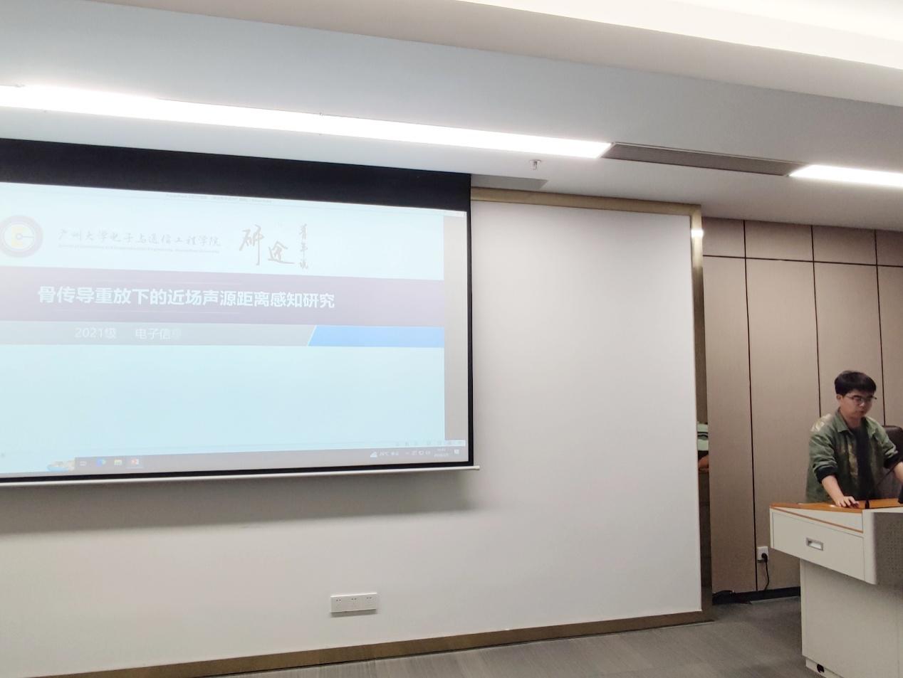曾航同学汇报的主题是骨传导重放下的近场声源距离感知研究,他的讲解主要包括以下六部分:选题背景及意义、现状与研究目标、研究方法及过程、关键技术与实践难点、研究结果与应用和论文总结。他简述了气传导和骨传导是两种不同的声音传导路径以及骨传导感知依赖的5个组成部分。这研究分为3个部分:骨传导的固有问题(辐射声、堵耳效应)所造成的影响的测量和分析;进行近场范围内,骨传导和气传导条件下,骨传导刺激位置为乳突,不同声源方向的声源距离感知实验;进行近场范围内,骨传导和气传导条件下,不同刺激位置,声源方向为侧向的声源距离感知实验和实验结果的分析。最后,曾航同学对论文进行了简要的总结。