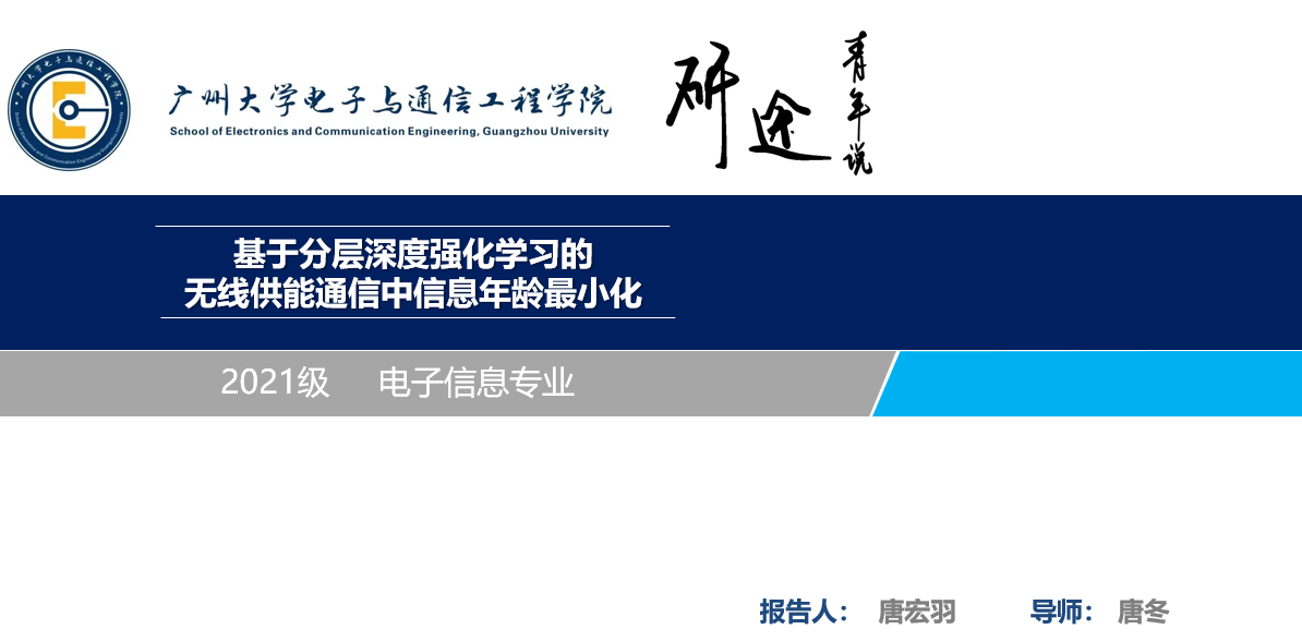 唐宏羽同学汇报的主题是基于分层深度强化学习的无线供能通信中信息年龄最小化,他的讲解主要包括以下五部分,研究背景、关键技术、系统模型、研究内容和研究难点。他首先介绍了关键技术:WPC和 BC 技术。紧接着详细介绍了基于机器学习的物联网入侵检测算法研究步骤:系统的状态采集、数据处理和信息传输过程对信息新鲜度的影响,通过结合 WPC和 BC 技术,设计一种联合优化采样策略来提升系统交付信息的新鲜程度,这对今后资源受限场景下新兴实时类物联网应用的进一步发展提供了重要的参考依据。最后,他对研究结果进行了全面的总结:对无线供能通信系统中的AoI最小化问题进行了研究。为了优化目的端的长期平均AoI,本文充分考虑了源端的采样成本并提出了一个新的JSUP方案,该方案优化了源端的状态更新模式并进一步研究了源端的发射功率对于AoI的影响。
