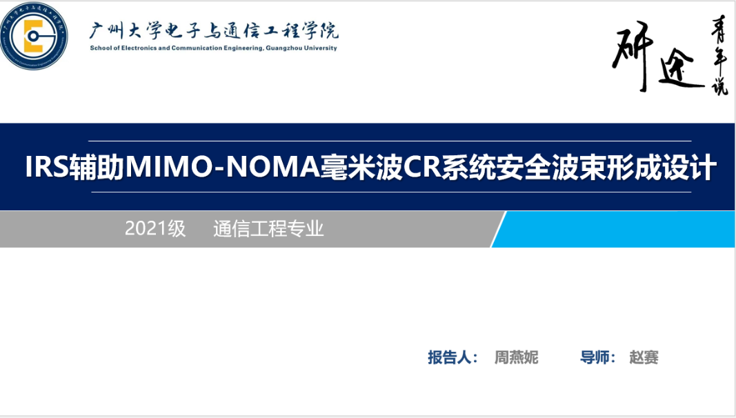 周燕妮同学汇报的主题是IRS辅助MIMO-NOMA毫米波CR系统安全波束,她的讲解主要包含以下五个部分:选题背景及意义、现状与研究目标、研究方法及过程、研究结果、研究总结。首先,她介绍了选题背景及意义,由于无线通信的广播特性,通信系统不可避免地面临信息泄露的问题,IRS可被用于提高信息安全性。然后,对智能反射面IRS技术、认知无线电技术和非正交多址NOMA技术进行了详细的阐述,并展示了研究结果。最后,对论文进行了总结,指出研究重点是智能反射面辅助CR-NOMA MIMO的安全波束成形设计。