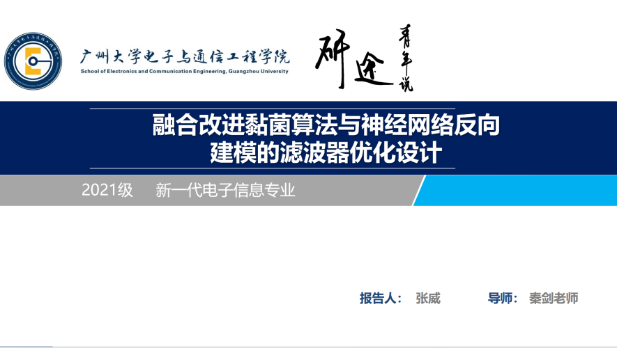 张威同学汇报的主题是融合改进黏菌算法与神经网络反向建模的滤波器优化设计。他的汇报主题包括以下四个部分:研究背景及意义、现状与研究目标、研究内容与方法、总结与展望。他讲解了微波滤波器是一种频率筛选器件,可以使信号中特定的频率成分通过而极大地衰减其它频率成分,在现代通信系统中具有不可替代的作用。随着频谱资源的利用率不断提高,信号间的频带间隔大大缩小,系统对信号保真程度的要求越来越高,因此对于微波滤波器性能的要求也逐渐提高。如何快速并准确地设计与优化出达到指定要求的微波滤波器成为了一项有价值的研究工作。还讲解了反向设计与代理模型、群智能优化算法。)引入正则化方法改进标准BP神经网络构建腔体滤波器代理模型用于替代传统电磁仿真软件,解决腔体滤波器设计过程中耗时费力、计算量大等问题。提出一种多策略融合改进的黏菌优化算法(Multi-strategy Improved Slime Mould Algorithm, MSISMA)。构建MSISMA-SR-BP代理模型与多目标粒子群优化算法进行结合,对梳状腔体滤波器进行多目标设计,并制作实物。