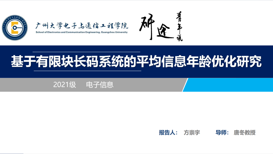 方崇宇同学汇报的主题是基于有限块长码系统的平均信息年龄优化研究,他的汇报主题包括以下五个部分:选题背景及意义、研究思路与方法、研究工作一、研究工作二、研究总结与不足。方崇宇同学讲解本文关注工业物联网中控制端对设备实时控制的数据新鲜度要求,研究了有限块长码系统的平均信息年龄优化问题。针对能量受限中继辅助的网络,研究了中继处SWIPT参数以及两跳码长对系统平均信息年龄的影响。问题表明,系统存在一个最优的SWIPT参数使得系统平均信息年龄最小。同时,不同于以错误概率为性能指标的研究,有限块长码系统过长的码长并不能取得更优的平均信息年龄。研究多用户传输问题,根据第一份工作给出的结论,考虑一个混合的多用户传输策略。通过将资源倾斜给较弱用户使得用户间性能公平性得到保证,即最小化用户间的最大平均信息年龄。结果表明,所提策略全程优于单独的传输方案。