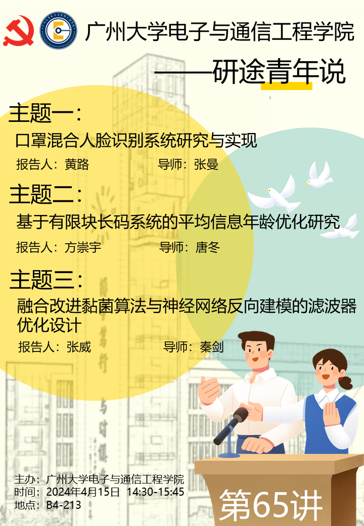 ”第65讲于4月15日14:30-15:45在B4-213举行。本次主讲人为21级研究生黄路、方崇宇和张威。