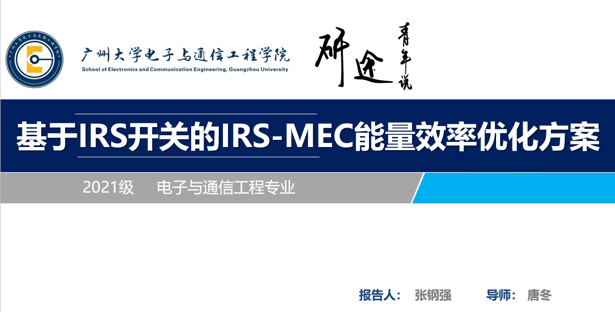 张钢强同学汇报的主题是基于IRS开关的IRS-MEC能量效率优化方案,他的讲解主要包括以下三部分,背景及意义、研究内容和研究结果及分析。他首先阐述了智能反射面(IRS)能够通过反射信号来改善信号的通信环境。智能反射面是由三层结构和一个可调控制器构成。其次当无线信道受到严重衰减或遇到障碍物时,IRS的部署能够有效地改善信道条件,从而显著提升系统的性能。绿色通信作为未来通信发展的一个方向,在IRS大规模部署的情况下,IRS的能耗就需要作为系统的一部分进行考虑。紧接着他对研究内容进行了概括:IRS的开关策略仅仅对整体系统进行优化,而更精细地对每个设备传输任务过程中所调用IRS的策略进行单独优化,则能更好地提升整个系统的性能,因此在多设备的情况下,让每个设备能单独优化IRS开关策略,是个值得研究的方向。
