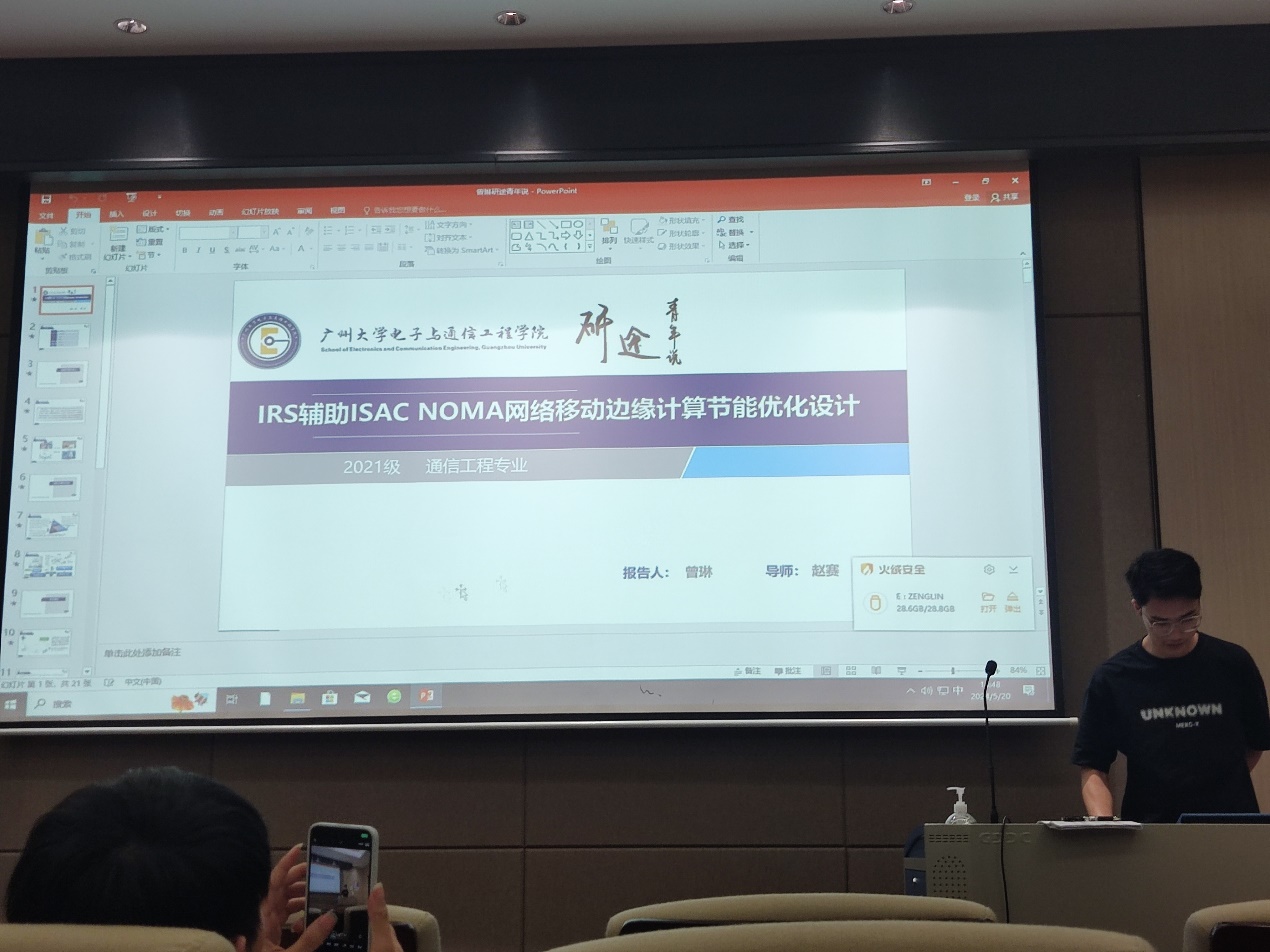 曾琳同学汇报的主题是IRS辅助ISAC NOMA网络移动边缘计算节能优化设计,他的讲解主要包括以下五部分,研究背景、关键技术、系统模型、研究内容和研究难点。他首先介绍了关键技术:物联网技术将在下一代无线通信中发挥关键作用,因为它能够实现大规模智能设备的连接和扩散。由于物联网技术的进步,增强现实、虚拟现实、自动驾驶和农业监测等各种现代应用正在彻底改变人们的体验。紧接着详细介绍了研究步骤和未来工作展望,实际通信系统中,由于信道状态信息的获取受限于各种因素,如测量误差、信道估计不准确等,往往无法获得完美的信道状态信息。在这种情况下,系统的设计和优化将面临更大的挑战,需要考虑如何在不完美的信道状态信息下保证系统性能和效率。当获得不完美信道状态信息的时候,系统的优化情况可能会发生变化,这也是一个有待未来研究考虑的重要问题。