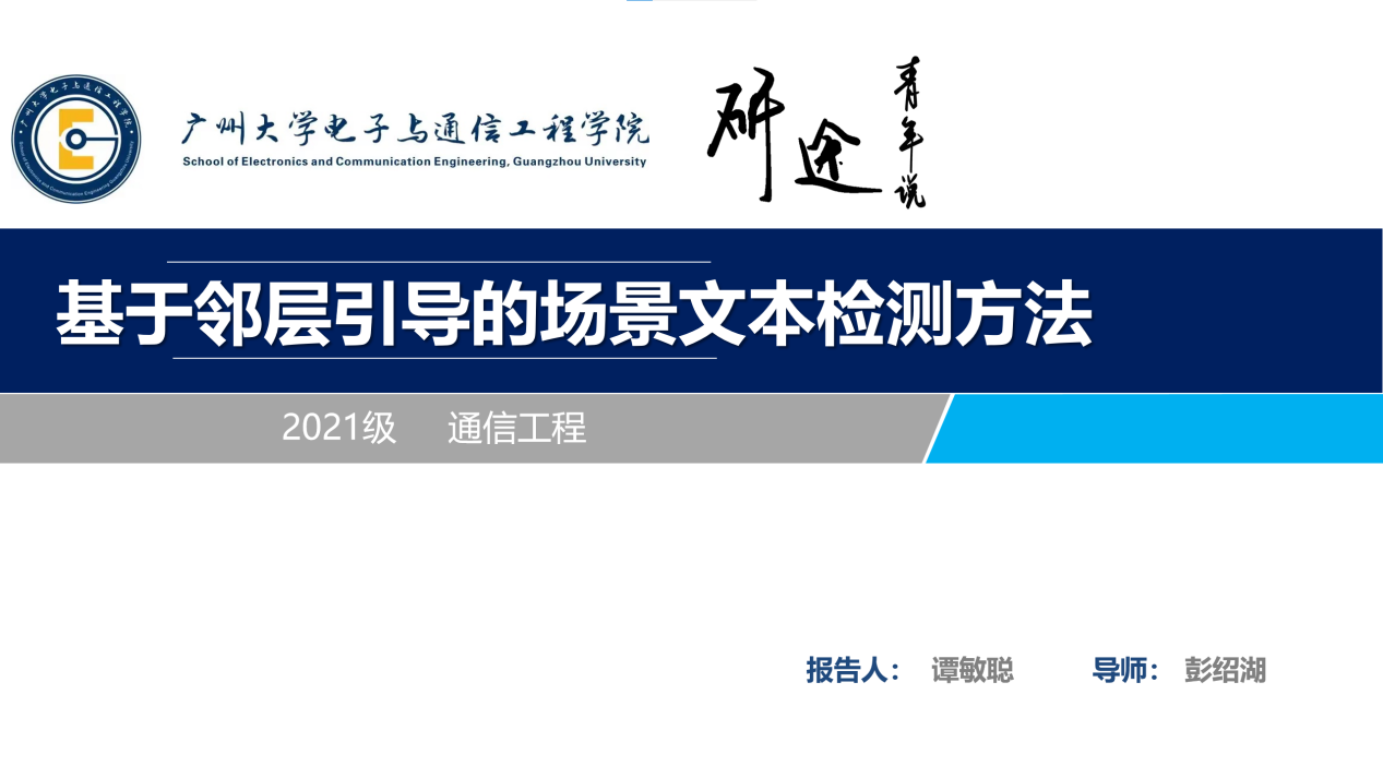 谭敏聪同学汇报的主题是基于邻层引导的场景文本检测方法,他的讲解主要包括以下四部分:选题背景及意义、现状与研究目标、研究方法及过程、研究结果与应用。首先,他介绍了该课题的研究背景和意义,并指出深度学习的引入使得适应各类场景的场景文本检测成为可能。对于特征融合不充分、文本信息复杂以及小文本难检测的现有问题,他提出了研究目标:删除自顶向下的路径,改使用跨层级引导;跨层级引导,以及权衡高低层级的信息比重;尝试在分割的任务中引入回归方法的要素:拟合文本实例,捕获长程依赖。然后,对研究方法、过程进行了详细地讲解,同时指出其改进方法在于特征融合部分与预测头部分。最后,他展示了研究结果与应用,并对进行了总结。
