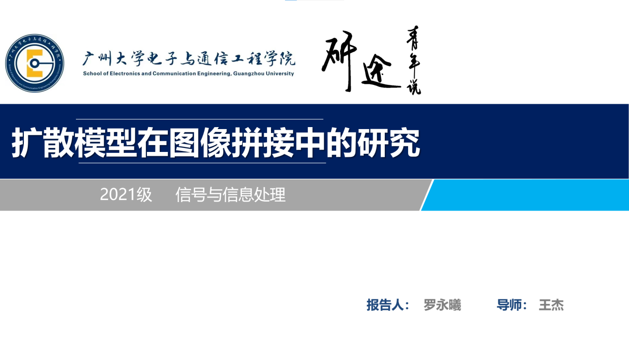 罗永曦同学汇报的主题是扩散模型在图像拼接中的研究,他的讲解主要包括以下六部分:选题背景及意义、现状与研究目标、研究方法及过程、研究结果与应用、论文总结。研究背景显示,图像拼接旨在获得视野更广阔的图像,然而由于多张图像叠加的视野很少是完全的矩形,所以在非重叠区域总会存在各种不同分布的不规则的边界,同时由于现有算法无法获得完美的对齐,难以避免的在重叠区域的边界处会出现纹理错位从而形成拼接缝。然后,介绍了三种研究方法:使用扩散模型(diffusion model)这种生成式模型作为补全模型;构建算法计算不规则边界与拼接缝的位置生成掩码;构建一种能将图像以任意分辨率表示且感知损失尽可能低的算法。实践难点在于:计算资源需求高、数据质量依赖和复杂的超参数调优。最后,他展示了研究结果,对研究结果进行了分析,并对论文进行了总结,也给我们提出了一些小建议。