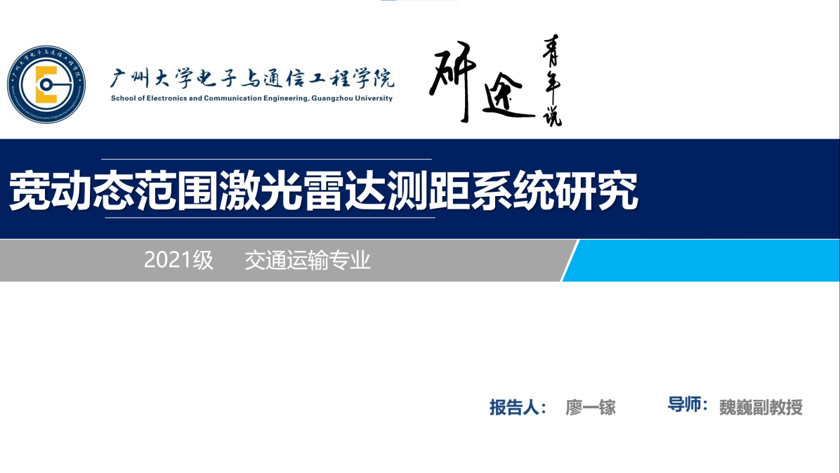 廖一镓同学汇报的主题是宽动态范围激光雷达测距系统研究,他的讲解主要包括以下六部分:选题背景及意义、研究内容、硬件电路设计、控制程序设计、样机调试、论文总结。他首先介绍了选题背景,在无人驾驶汽车领域中,激光雷达作为最重要的传感器之一,在无人物流车、自动驾驶汽车补盲等领域的应用与交通工程息息相关。并指出激光雷达、毫米波雷达和摄像头是公认的自动驾驶的三大关键传感器技术。然后,介绍了激光雷达测距原理、激光雷达测距原理与基本构成、激光雷达时刻鉴别原理和TDC芯片计时原理。他还对硬件电路设计和控制程序设计以及样机调试进行了详细地讲解,通过对实验结果的分析得出了相应结论。最后,对论文进行了总结,并提出了对未来研究工作的展望。