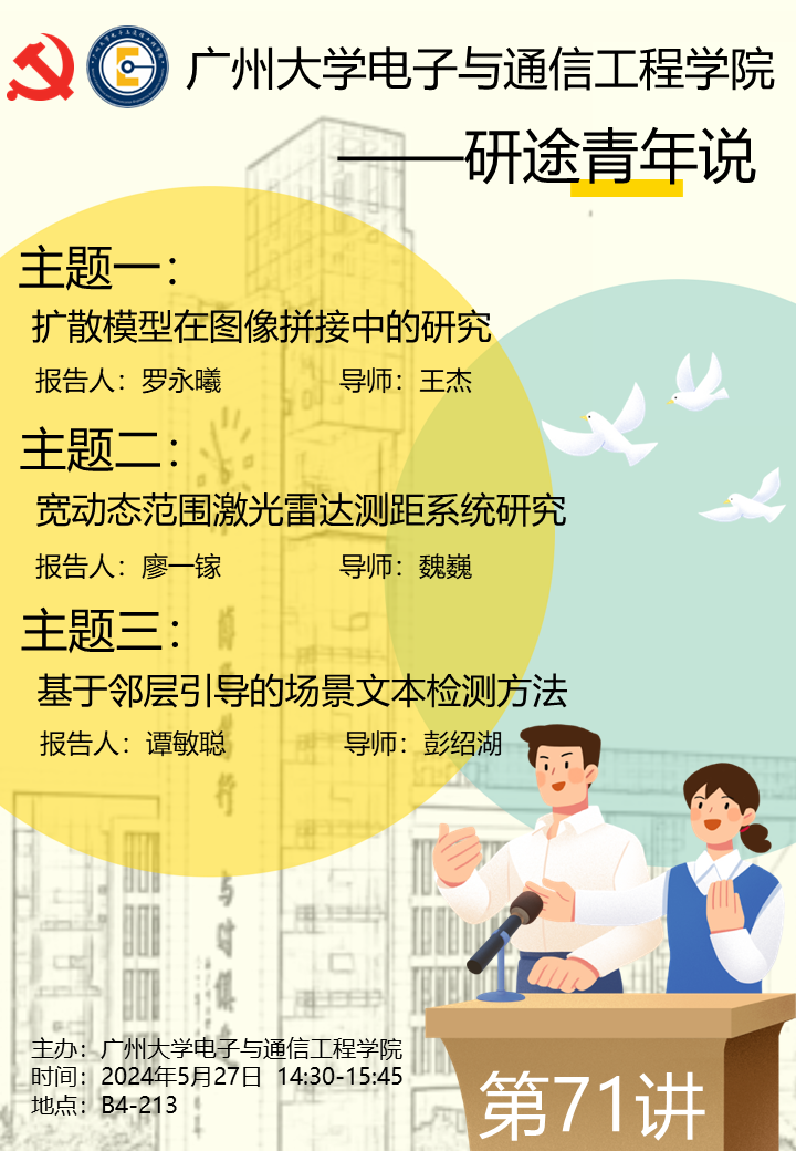 ”第71讲于5月27日14:30-15:45在B4-213举行。本次主讲人为21级研究生罗永曦 、廖一镓和谭敏聪。