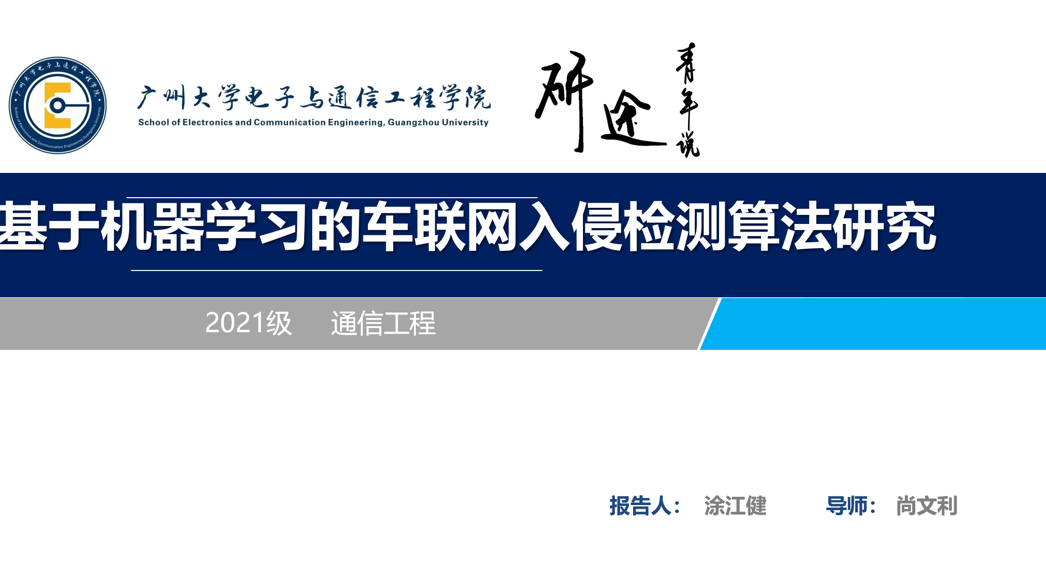 涂江健同学汇报的主题是基于机器学习的车联网入侵检测算法研究,他的讲解主要包含以下5个部分:选题背景及意义、现状与研究内容、研究方法与过程、研究结果与应用、总结与展望。目前大多数入侵检测方法基于非常复杂的模型,例如一些深度学习方法可以达到很高的准确性,但其模型高度复杂性需要大量的计算资源,使其不太合适在车辆系统中部署。现有研究大都偏向高精度,在轻量化研究上尚且不足,存在模型复杂等问题。数据的攻击类型往往有很多种,检测时需要分辨其具体属于哪种攻击类型。因此,入侵检测问题是一个多分类问题,检测难度要大于单纯的二分类问题。为了实现对车联网内外网络中潜在网络攻击的准确有效检测,对于第一种入