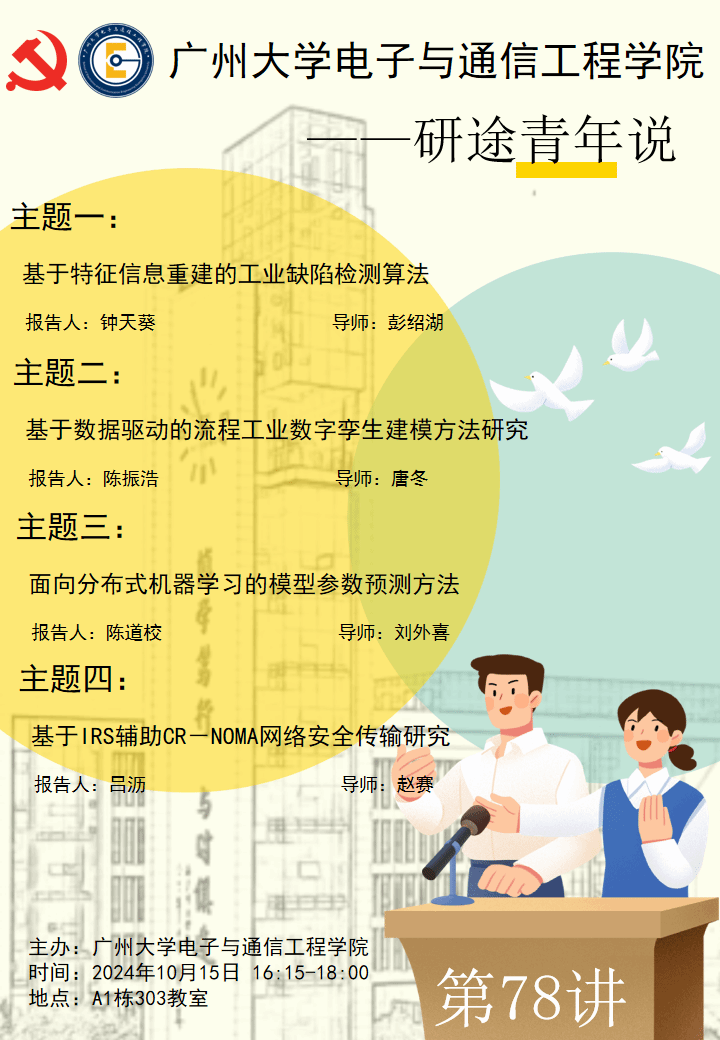 ”第78讲于10月15日16:15-18:00在黄埔研究院A1栋303教室。本次主讲人为22级研究生钟天葵、陈振浩、陈道校和吕沥。