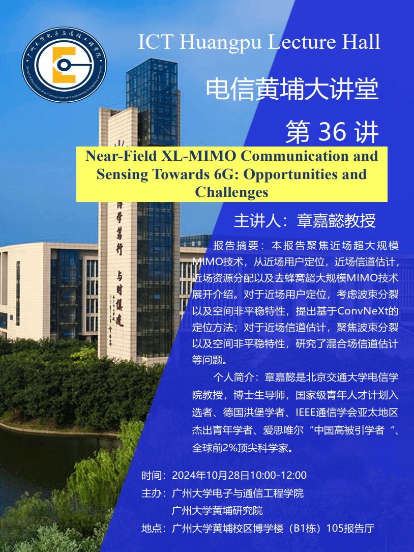 主办的电信黄埔大讲堂第36讲在黄埔校区博学楼(B1栋)105报告厅举行。本次大讲堂的主题是:Near-Field XL-MIMO Communication and Sensing Towards 6G: Opportunities and Challenges。主讲嘉宾为章嘉懿教授。本次大讲堂由sm调教