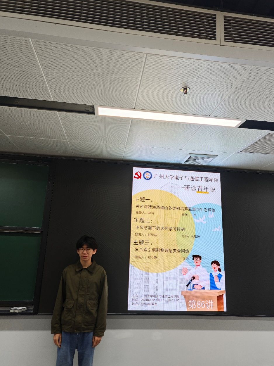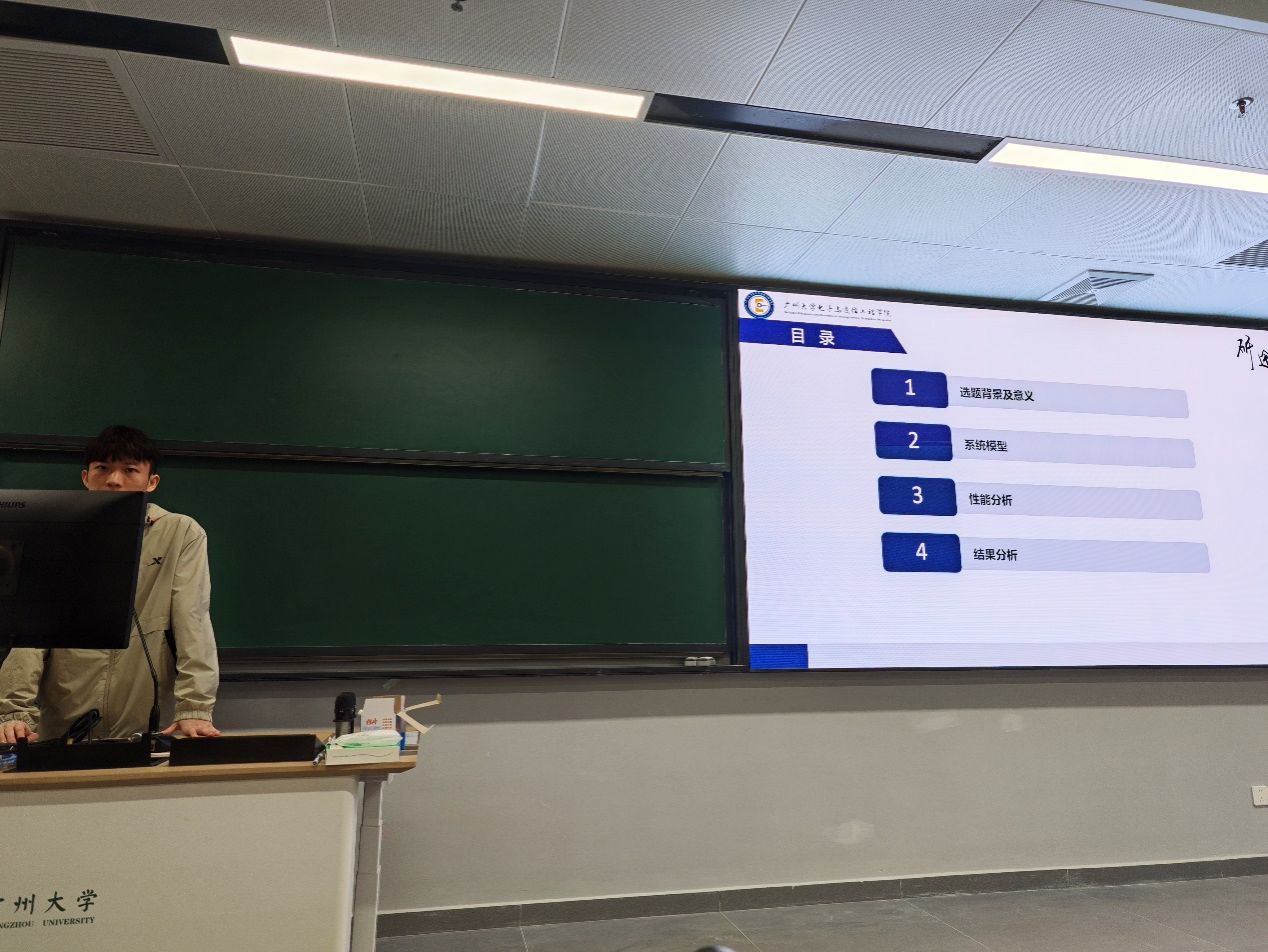 郑立新同学汇报的主题是:复合索引调制物理层安全网络。在非正交多址接入网络中近用户由于执行连续干扰消除会对远用户信息带来安全隐患,同时也限制了系统性能。在所提网络中通过将序号调制引入到NOMA中,为不同的用户分配不同的信息维度,同时,针对近用户有可能窃取到远用户信息的情况研究一种基于瞬时信道质量信息的安全传输策略并分析性能,最后通过仿真结果验证所提方案的有效性。