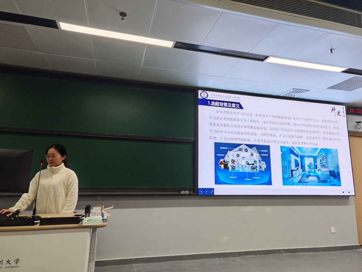 刘欣茹同学汇报的主题是多传感器下的迭代学习控制。多传感器下的迭代学习控制是一种通过多个传感器对控制系统进行实时反馈和学习的控制方法,主要用于在重复性任务中改善系统的性能。在每次实验中,系统的输出被反馈到控制器,控制器根据误差修正控制指令,从而逐步提升系统的性能。变轨迹长度的引入增加了实际中多传感器每次迭代运行区间变化的情况,提高系统的灵活性和通用性;输入饱和的引入考虑到实际输入中存在的物理限制,避免了由于过高的输入导致系统失控或硬件损坏的问题。