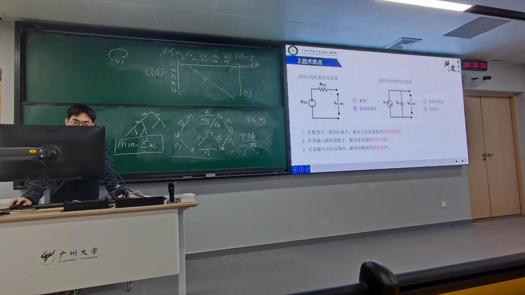 朱嘉乐同学主要研究了用于交直流能量采集的系统转换器芯片,他首先讲述交直流能量采集在为物联网设备供电方面具有的独特优势,随后阐述交直流能量采集技术的实现难点,指出了在模型不一致、多输入源,宽输入电压范围的情况下,交直流能量采集领域存在着诸多问题。随后引出共享单电感可以扩大输入范围、提高轻载下的转换效率并提高重载下的转换效率,是解决交直流能量采集的实现难点的技术路径。
