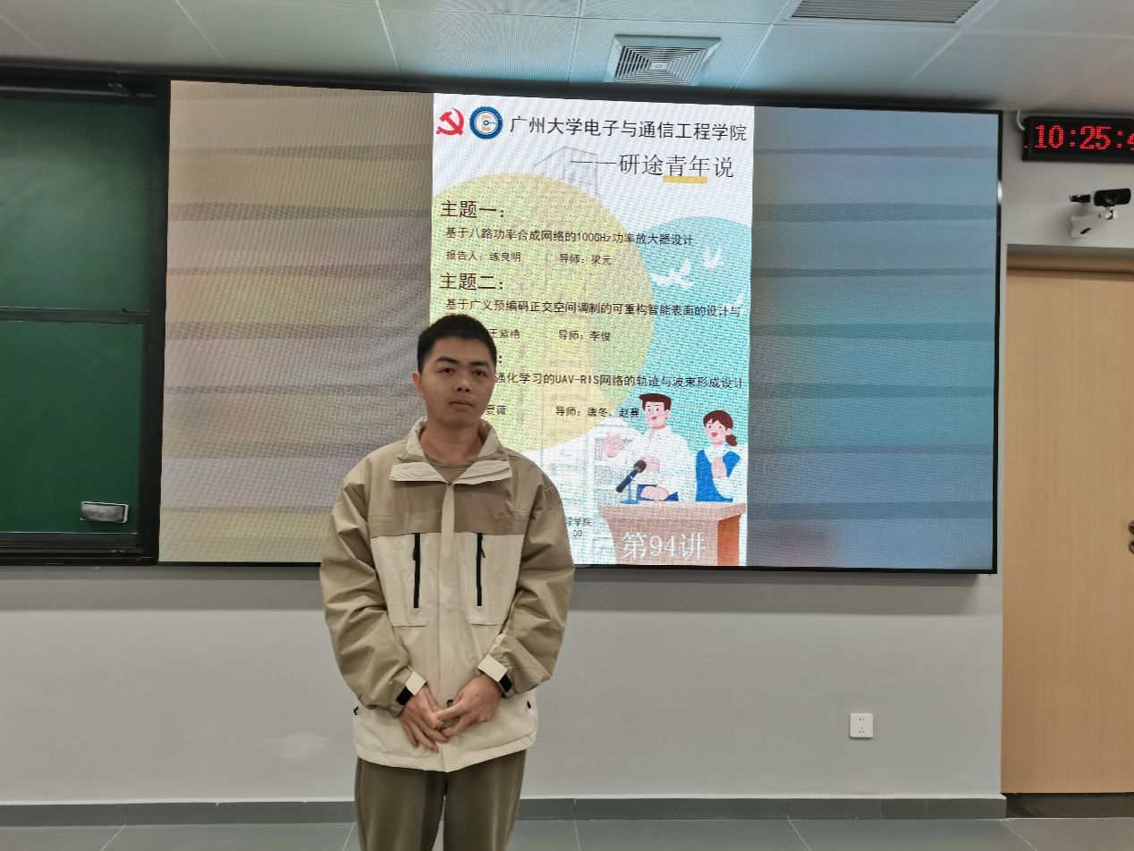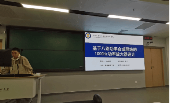 练良明同学汇报的主题是基于八路功率合成网络的100GHz功率放大器设计,他的讲解主要包含以下4个部分:选题背景与意义、研究内容、研究结果、工作总结。练良明同学介绍了太赫兹集成电路发展趋势和本研究的主要成果。首先介绍了THz集成电路面临的难点,随着近些年半导体工艺技术的进步,已经能够支持太赫兹频段的电路设计。其次,他介绍了THz功率放大器的设计方向和趋势,以及国内外优秀的PA设计研究成果。第三,他介绍了本研究中无源器件的设计方法、有源电路的结构设计以及版图设计,并给出了本研究PA的性能指标,最后与国内外顶刊PA进行了对比,对比显示,本研究在核心面积、高增益、输出功率以及附加效率等方面具有较大优势。