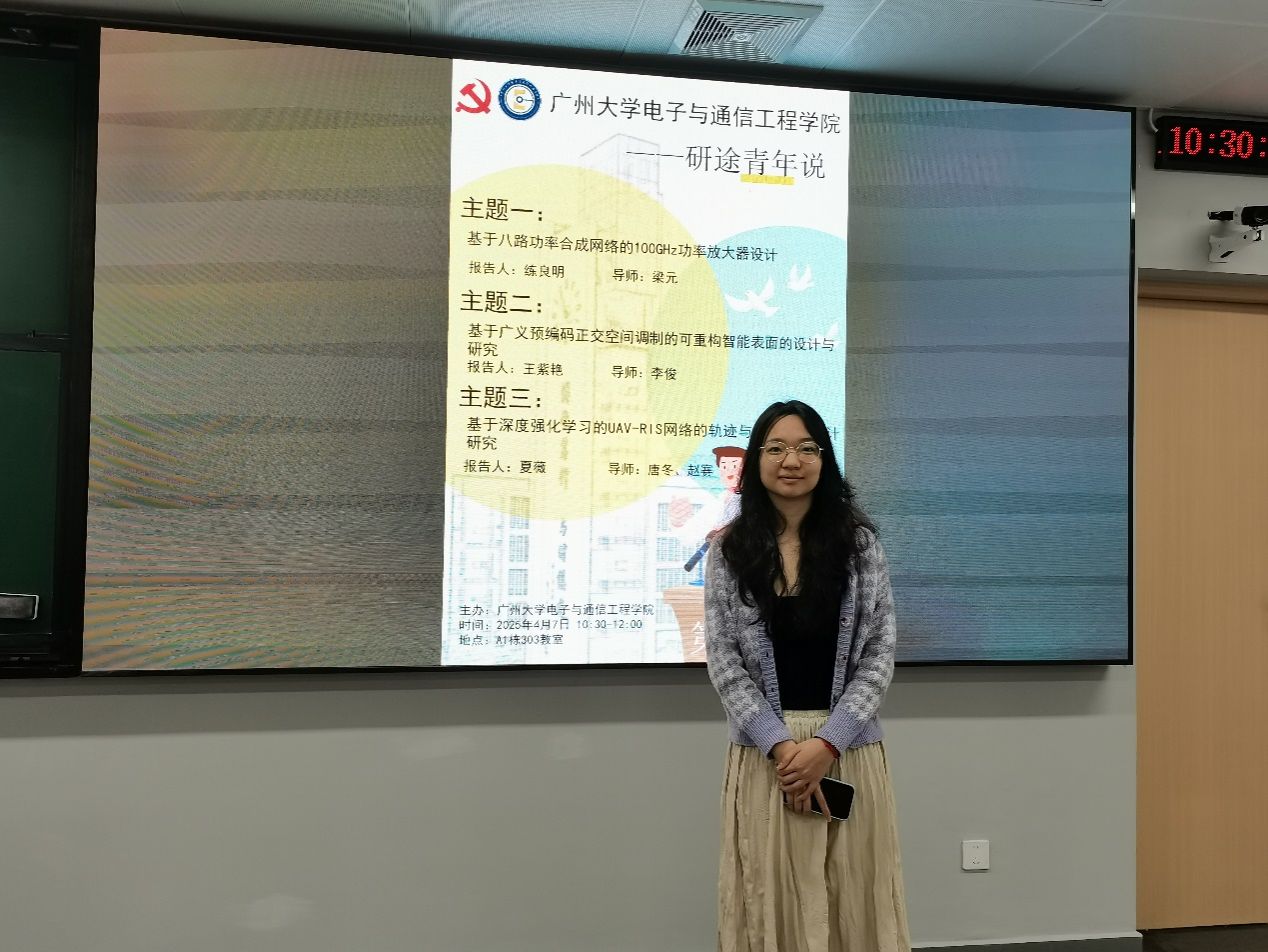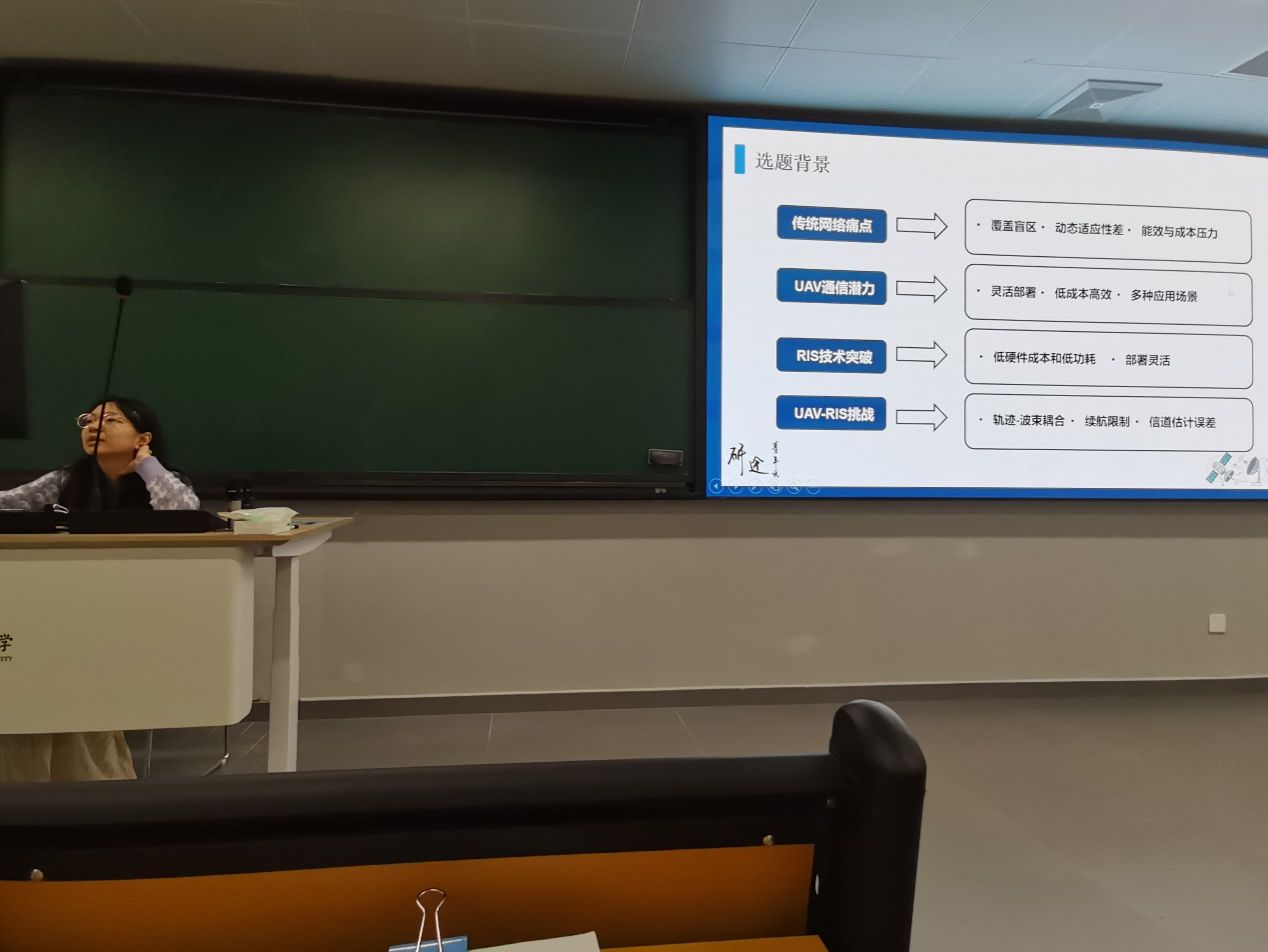 王紫艳同学汇报的主题是基于广义预编码正交空间调制的可重构智能表面的设计与研究,她的讲解主要包含以下4个部分:研究背景及意义、研究内容、总结与展望、研究成果。王紫艳同学围绕“基于广义预编码正交空间调制的可重构智能表面的设计与研究”展开,针对下一代无线通信系统中的频谱效率、能效和复杂度优化问题,结合可重构智能表面(RIS)和广义预编码正交空间调制(GPQSM),提出了一种新型的RIS-SM通信方案。首先,她回顾了可重构智能表面(RIS)技术的基本原理及其在无线通信中的应用,探讨了RIS在空间调制(SM)系统中的作用。接着,王紫艳同学构建了RIS-SM系统模型,详细分析了信号传输过程,并结合广义预编码策略优化RIS的相位配置。然后,她从系统容量、误比特率(BER)、信号干扰抑制等方面对RIS-SM系统的性能进行了理论推导和仿真分析,验证了所提方案的有效性。此外,她还将RIS-SM系统与传统MIMO、NOMA等多种先进通信技术进行了对比,证明了RIS-SM方案在降低能耗、提高频谱效率等方面的优势。仿真结果表明,RIS-SM结合GPQSM能够在保证通信可靠性的同时显著提升系统的频谱效率和能效,并且在高SNR条件下能够进一步降低误比特率。同时,RIS的智能调控特性使得该方案在未来6G网络的智能通信环境中具有广阔的应用前景。尽管本研究取得了一定的进展,但仍然存在一些挑战和局限性,如RIS的实际硬件实现问题、信道估计的复杂度、动态环境下的自适应优化等。未来的研究可以进一步探索RIS-SM与深度学习、自适应控制算法的结合,以提升系统的自适应性和抗干扰能力。此外,RIS-SM的能量效率优化以及在多用户场景中的扩展应用也是未来研究的重点方向。综上所述,她的研究不仅为RIS-SM技术的发展提供了新的理论支撑,也为未来智能无线通信系统的设计提供了新的思路和参考。