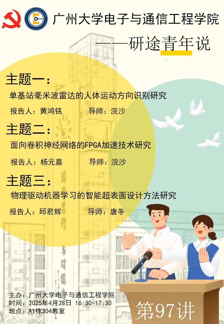 ”第97讲于4月28日16:30-17:30在黄埔研究院A1栋304教室。本次主讲人为研究生黄鸿铭、杨元嘉和邱君辉。