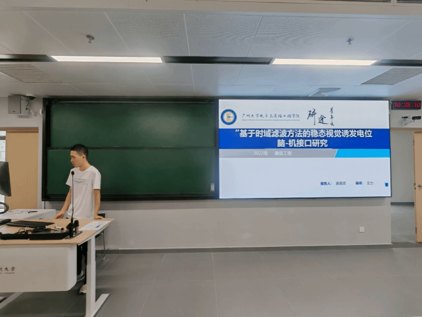 徐国贤同学主要介绍了针对SSVEP中的时间噪声影响,研究提出一种基于F范数的隐性时域滤波器方法。该方法利用F范数二维线性判别分析作为基本模型,利用迭代法估计得到更加精准的空间滤波器,消除异常值的影响。基于扩展典型相关分析法,在F范数的基础上整合人工正余弦信号来充分提取SSVEP通用谐波特征,再结合个人特征与通用特征信息输出结果。该方法在两个公共数据集上均优于经典方法,且参数量低。在显性时域滤波方法角度上,基于训练数据驱动典型相关分析和邻接矩阵的特性,提出了一种用于稳态视觉诱发电位分类的新方法,该方法集成了空间滤波器并能抑制局部噪声。通过将正弦和余弦参考信号与各个模块相结合,对这一新颖方法进行了扩展。此外,通过引入人工参考信号来额外提取稳态视觉诱发电位中的信息,从而增强从各个模板中获取的信息。在两个数据集上进行了对比实验,以评估所提出的方法以及其他几种先进算法在不同场景下的性能。实验结果证明了我们所提方法的优越性。