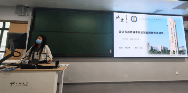 杨小萱同学汇报的主题是雷达有源欺骗干扰的智能抑制方法研究,她的讲解主要包含以下4个部分:选题背景和国内外研究现状、雷达探测原理和间歇采样转发干扰、端到端的时域复值干扰抑制网络以及总结与展望。在当今的研究中,中断采样转发干扰以其相干处理增益和灵活的调制技术为特点。而ISRJ在整个范围内产生假目标,这对雷达系统提出了重大挑战。但是,现有的ISRJ抑制方法很难在不损害真实目标信号完整性的情况下消除干扰信号,从而导致副瓣恶化和检测性能下降。对于以上情况,杨小萱同学提出了一种基于信号分解的复值编码器-解码器网络(CVEDNet)来解决这些挑战。该网络提供了一种基于复值时域信号的端到端抑制ISRJ的方法,而无需对干扰信号进行时频预处理。编码和解码结构抑制噪声,更准确地提取回波特征。采用叠置双支路结构和多尺度展开卷积进一步分离回波信号和基于高维特征的ISRJ。多域组合损失函数将波形和距离信息结合起来,保证了重建回波波形幅度和相位的完整性。从干扰抑制能力、回波保真度和检测性能指标等方面验证了该方法的有效性。