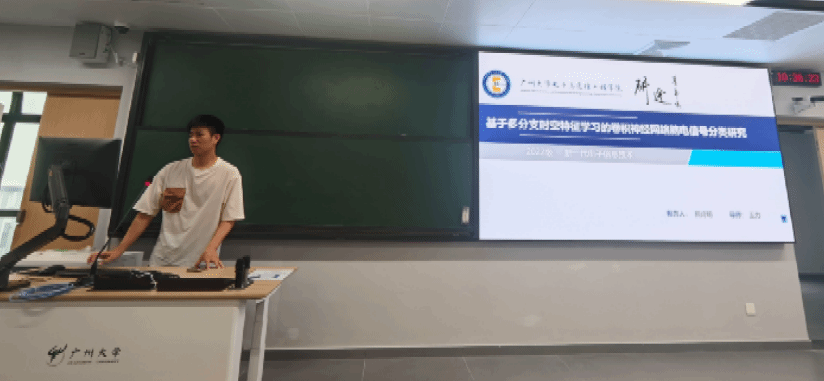 熊诗明同学汇报的主题是基于多分支时空特征学习的卷积神经网络脑电信号分类研究,他的讲解主要包含以下6个部分:研究背景及意义、现状与研究目标、研究方法及过程、关键技术与实践难点、研究结果与应用以及论文总结。熊诗明同学主要介绍了脑机接口技术中的运动想象脑电信号分类并且针对EEG信号的低信噪比、非平稳性及个体差异等挑战,提出了一种融合多分支结构与双向时间卷积的深度学习模型(MBCNN-EATCFNet),该模型通过引入高效注意力机制和自适应加权方法,丰富了时空特征提取与融合的理论框架,为EEG信号处理提供了新的技术路径。该模型在两个公共权威数据集上使用受试者依赖与受试者独立训练策略进行评估,与多个基线模型相比,达到了最高的平均分类准确率,且具有良好的泛化能力。