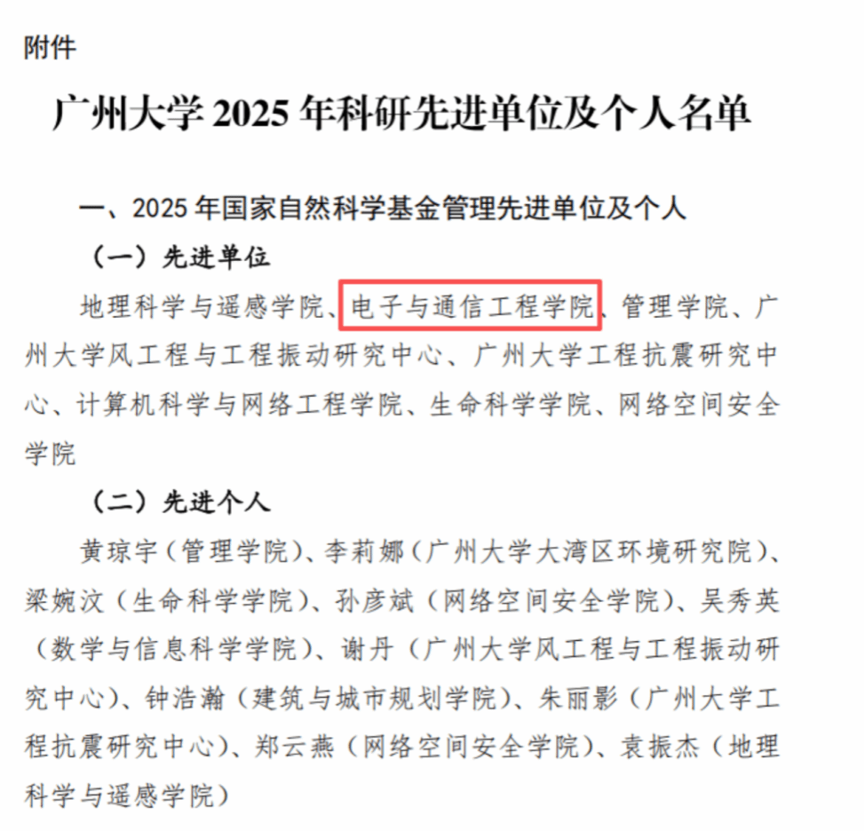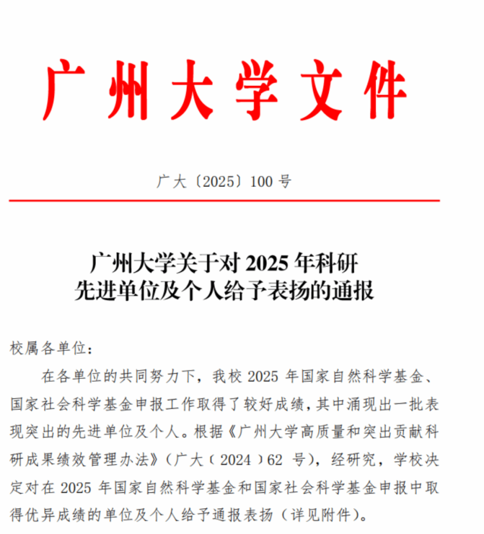 高质量和突出贡献科研成果绩效管理办法》(广大﹝2024﹞62号),经研究,学校决定对在2025年国家自然科学基金和国家社会科学基金申报中取得优异成绩的单位及个人给予通报表扬。其中,我院获评2025年国家自然科学基金管理先进单位。