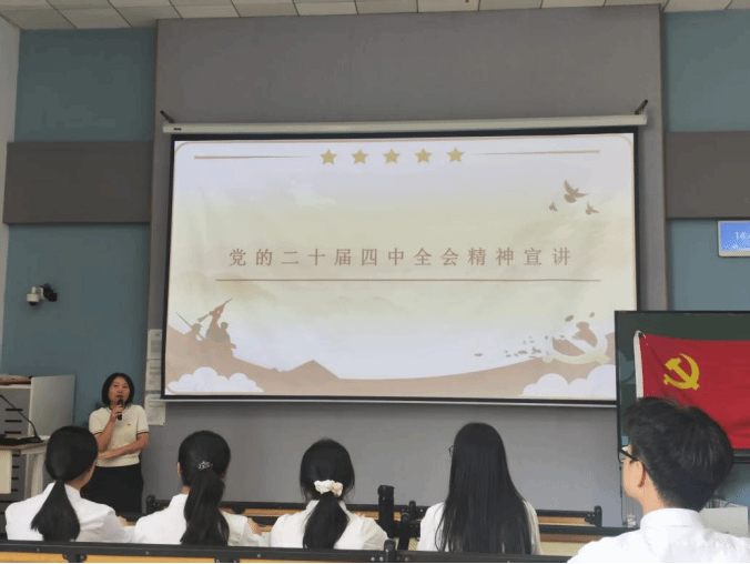 学生第一党支部支部书记欧阳曦老师进行党的二十届四中全会精神宣讲。她指出,全会为中国式现代化擘画了宏伟蓝图,强调文化建设与青年担当的重要意义。老师鼓励大家深刻领悟全会精神,将红色经典传承与时代使命结合,坚定理想信念、锤炼专业能力,以实际行动践行全会要求,从日常小事开始,服务社会、贡献社会,在青春赛道上挺膺担当。(文案:谢咏斯 审核:谢玲、王沁芳)