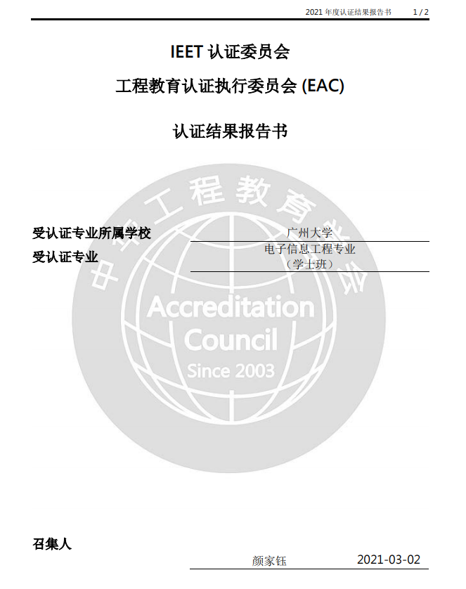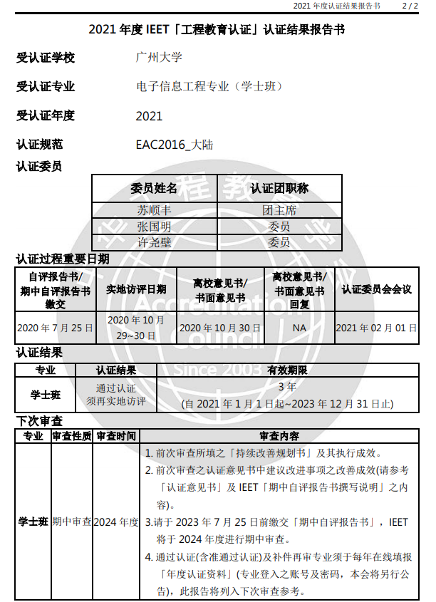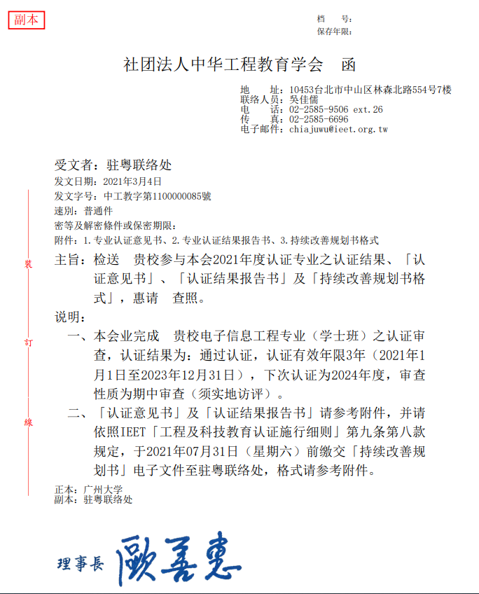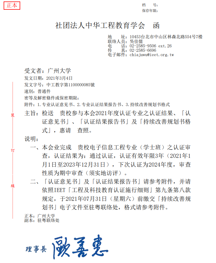 3月4日,我院收到中华工程教育学会关于我院电子信息工程专业(学士班)通过认证意见书、认证结果报告书及持续改善规划书格式等函。我院电子信息工程专业于2020年10月29日-30日接受访评,10月30日收到离校意见书,此次认证的有效期间是3年(自2021年1月1日起至2023年12月31日止)。