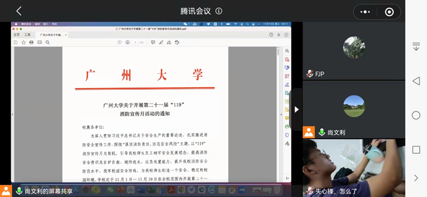 响应疫情防控号召,通过腾讯会议形式,给学院2021级全体新生举办了一场以“关注实验安全,共建平安校园”为主题的开放实验室安全讲座。学院党委书记陈泽龙、院长唐冬、副院长尚文利、副院长曾衍翰、党委副书记谢玲、综合办主任李玉、辅导员张虓,实验师冯锦澎、陈耀华、朱洁淇以及院办、学工办、实验室等相关老师参加了会议。