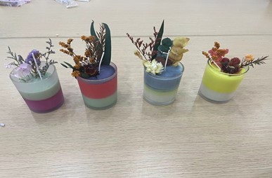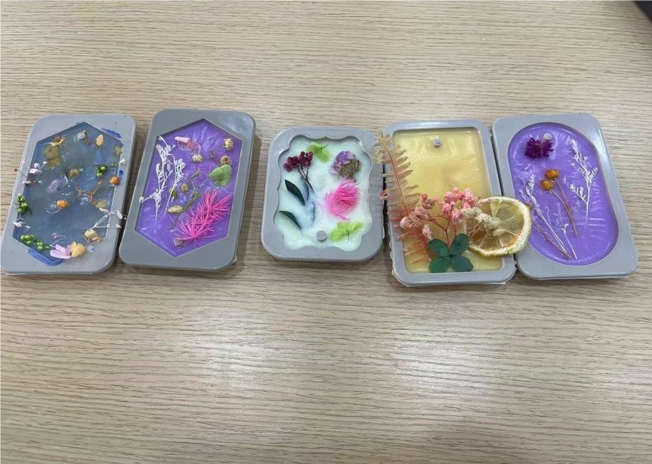 活动现场,指导老师用生动的语言讲解如何燃烧豆蜡、添加精油、添上色素、倒入模具、选放花材、脱模、挂绳等一系列的操作步骤。在放置干花的环节中,老师们充分发挥自己的想象力和创造力,将精心设计好的花瓣和干花组合小心翼翼地放置在蜡上,等待其凝固之后再脱模取出蜡片。转眼之间,色彩美轮美奂,散发出怡人清香。