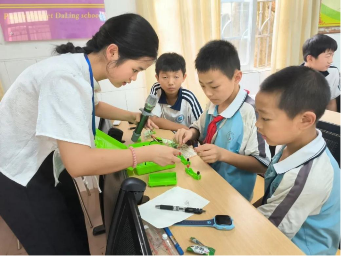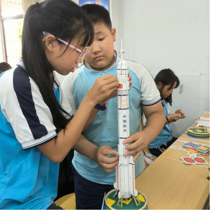 航天科普不单单只有理论知识,还有实践教学!在“三下乡”志愿服务团队的帮助下,同学们不仅体验到自己动手组装航天模型的快乐,更能体会同学之间相互合作的强大力量。“三下乡”志愿者服务队伍的教学传播的不仅是知识,更是创新和团队合作精神。
