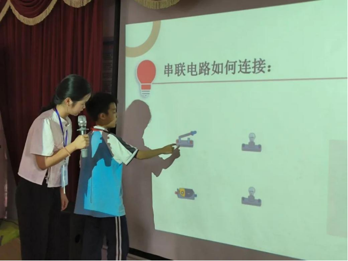 最让同学们兴奋的环节是在“助教”和“老师”们地指导下,同学们争先恐后地连接着电路元件,生怕不能将全部电路都连接体验一遍,感受电路当中的乐趣。在此过程中,他们怀揣着一颗热忱而又单纯的心,用那最为纯粹的目光去探索着这个电路的奥秘。