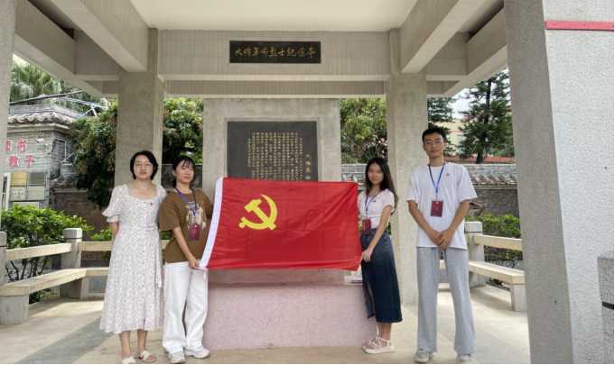 实践团首先来到了革命烈士亭。大岭革命烈士纪念亭位于村子的东南方向,在村小学前的小山丘上,是由抗战时期在大岭村工作和战斗过的珠纵一支队的游击队员与大岭村村委、石楼镇镇委共同出资兴建的。为纪念在抗日战争、解放战争和抗美援朝战争中牺牲的14位大岭村的革命英烈而建。亭子内立有白色镶边的黑色石碑,记述了14名英烈的名字和大岭村的主要抗战事迹。