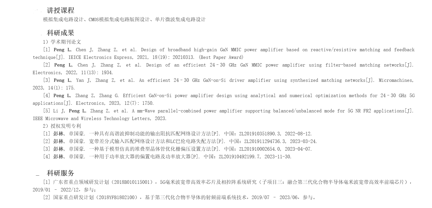 ;主要从事通信终端中射频与毫米波单片电路及组件等方面的理论与技术研究,特别是功率放大器(PA)、低噪声放大器(LNA)和开关(SW)设计。